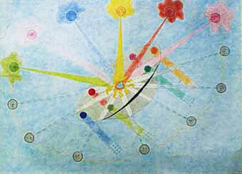 | Este dibujo celeste explica como es la construcción de un platillo volador en los lejanos soles; en esta construcción participan infinitos soles en toda dimensión; al crearse una nave, surgen inteligencias solares; es un llamado a reencarnar; a nacer de nuevo en una filosofía cuya base será la velocidad materializada; es una transformación en la Santísima Trinidad; los discos de color grises son querubínes de magnetismo viviente; dispuestos a solidificar las otras virtudes vivientes; pues toda la creación nace de alianzas magnéticas; un platillo volador es un acuerdo entre soles; todos aportan a la realización de la nave; tal como en la Tierra, en que muchas inteligencias contribuyen a la construcción de los aparatos terrestres; lo de arriba es igual a lo de abajo; hay alianzas arriba y las hay abajo; entre lo de arriba y lo de abajo, exsiste un infinito; en que gravitan infinitos mundos salidos del conocimiento y expandiéndose en conocimiento; entre la infinita diversidad de mundos, está el universo de los platillos voladores; conocidos en el Reino de los Cielos, como naves plateadas; al igual que la Tierra, las naves plateadas viven eternas evoluciones; sus poderes y grandezas, no tienen límites; avanzan paralelo al avance de los universos; los platillos voladores representan las antiquísimas filosofías de mundos que ya no están donde estuvieron gravitando en el espacio; grandezas pasadas y vividas en un Cosmos desconocido para el género humano; porque muchas moradas planetarias tuvo, tiene y tendrá el divino Padre; hasta vosotros hijos terrenales, eternidades más adelante y viviendo en otro mundo diréis: Viví en un lejano y microscópico planeta llamado Tierra; allí probé la filosofía de monito de carne; los mundos desaparecen y los espíritus se quedan con la experiencia; con el conocimiento; de él, nace su futuro cuerpo; los platillos voladores cumplen igual ley; porque la divina justicia está en todas partes; tanto arriba como abajo, exsiste conocimiento viviente; presenciar como se construye una nave plateada, es presenciar lo supremo viviente; las maravillas de la Tierra desaparecen, ante tanta grandeza; y el recuerdo de lo presenciado, no se borra jamás del espíritu; y lleva esta revelación de mundo en mundo; he aquí la causa de un genio del espacio; ó de un escritor galáctico; ó un innovador en aparatos que tengan que ver con magnetismo; porque la propia intuición a sido magnetizada en un grado mayor; magnetización realizada en otro punto del espacio; es como ser de fuego de cierto grado; y de improviso se recibe una porción de fuego de grado mayor; las virtudes que suman 318 en el espíritu humano, son de fuego viviente; y poseen jerarquía en su propia cualidad; quien posea grado mayor en su caloría, ese es el superior jerárquico; esta ley que está en vosotros mismos, se cumple en todo el universo expansivo pensante; arriba y abajo; en el macro y en el microcosmo; en sus infinitos cielos; en el microbio y en lo colosal; siempre a sido así en la eternidad; cada mundo cada platillo volador, cada sol representan una caloría de fuego, salida de otro fuego; del fuego del conocimiento; materia y espíritu son una misma cosa; son fuego; fuegos manifestados en diferentes libres albedríos y salidos del divino fuego del Padre; cuya caloría sobrepasa lo conocido; y así será por siempre jamás; porque el divino Padre se expande en todo lo imaginado; se viene expandiendo antes que nacieran los actuales mundos que gravitan en el espacio; exsisten creaciones del Padre, que jamás serán conocidas por las criaturas del universo; porque es inalcanzable; los platillos voladores representan una ciencia solar, entre infinitas otras; nadie en el universo puede proclamarse que a llegado a lo más superior en conocimiento; profundo y fatal error; porque mientras más se sabe, menos se sabe; sólo el Padre lo sabe todo; ese fué el error del llamado satanás; que siendo un ángel de categoría solar, se creyó con poder suficiente para mandar a todo el universo; la verdadera historia del demonio, recién se sabrá; porque es el primero en caer en el Juicío Final; porque al que sabe más, se le exige más; ¿no se a propagado por el mundo que satanás es sabio por lo viejo? por lo tanto es uno de los primeros en caer; el que la hace la paga; así se pidió en el Reino de los Cielos; las naves plateadas poseen una construcción que debe ser clasificada; porque el conocimiento no es el mismo en todas las criaturas; el conocimiento es tan relativo, como lo son los mundos materiales; materia y espíritu son relativos en grado infinito y eterno; los platillos voladores que han visitado la Tierra, son de la categoría Alfa y Omega; y sus formas son diversas e infinitas; cuando se construyen estas naves, ocurre lo siguiente: los soles o lumbreras solares, reciben un llamado telepático; que constituye la divina telepatía universal; propia de los soles primogénitos; el alcance de esta telepatía llega a todos los puntos del universo; y es un llamado amoroso; es un llamado al libre albedrío de los soles; es un llamado hecho por alguna jerarquía solar; es un llamado destinado a crear alianzas vivientes; es un llamado a combinar magnetismos de diferente poder mental; allí todos aprenden de todos; allí reina el comunismo celestial con filosofía de niños, en medio de una alegría, que es desconocida entre los seres humanos; los soles venidos desde remotísimos sistemas de vida, se agrupan en un punto determinado del espacio; son verdaderos carnavales de fuego viviente; soles de todos los colores imaginados; y en todos está el divino Padre; que como se os enseñó, Dios está en todas partes; las más elevadísimas jerarquías solares le ven; otras lo intuyen ó lo presienten; tal como se vé en el dibujo celeste, los soles forman un círculo Omega; al centro se coloca el padre solar, de mayor jerarquía; es decir el que tiene mayor poder creador sobre los